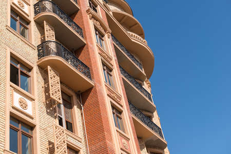 facade of a tall brick apartment building. Construction and real estate. Buying and selling an apartment
