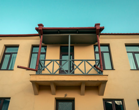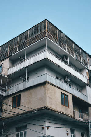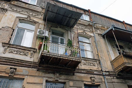 Old balconies on historic buildings in Tbilisi. View of the architecture of Georgia before reconstruction. Metal balconies with a roof in a two-story house.
