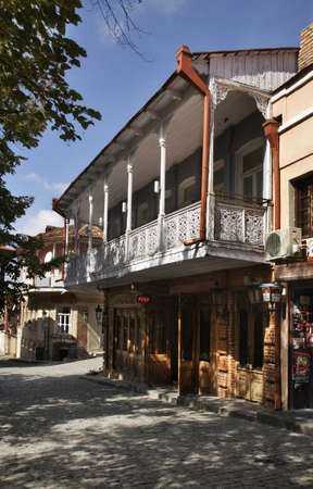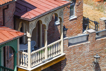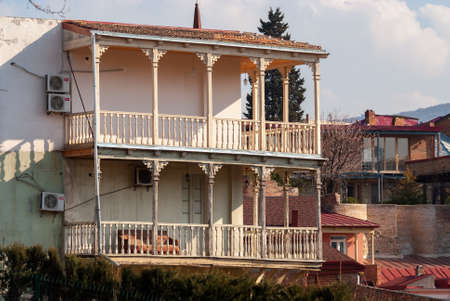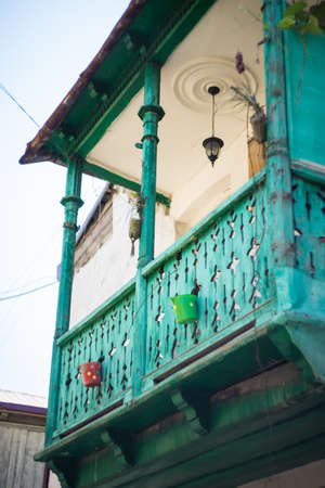 Traditional buildings with colorful carved wooden balcony in Tbilisi. Georgia.