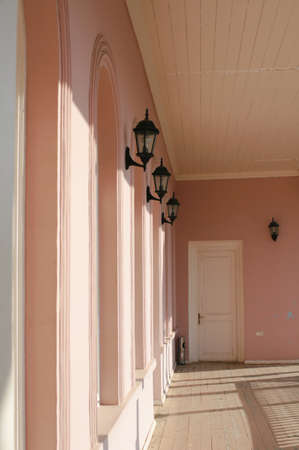facade of the white building with arches and balconies against the background of the blue sky
