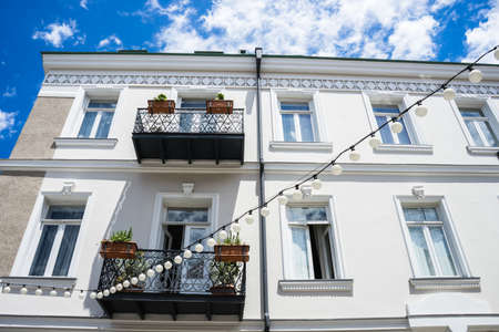 Front of house in Georgia, exterior, architecture of white blue residential building apartment