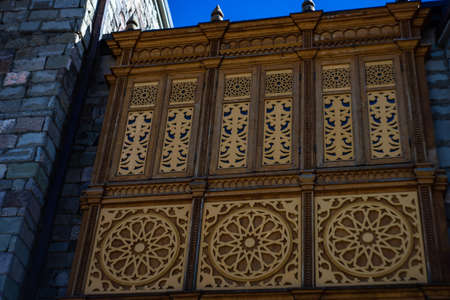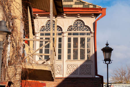 Ancient historical profitable carved houses made of wood are located on the streets of the modern city