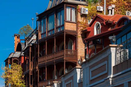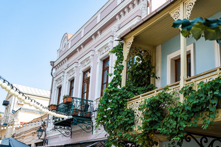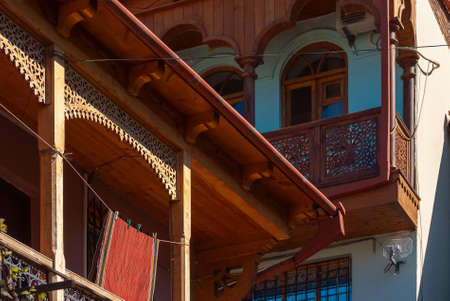 Traditional carved balconies and colorful wooden houses in the Old Town of Tbilisi, Georgia - sep, 2019.