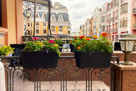 Blooming flowers in pots on street in residential complex. Pots with pink flowers adorns exterior of residential buildings in city. Landscaping and decoration.