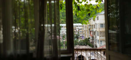 Nice view from the balcony, grape bush and residential buildings. The grapes grow right in the balcony