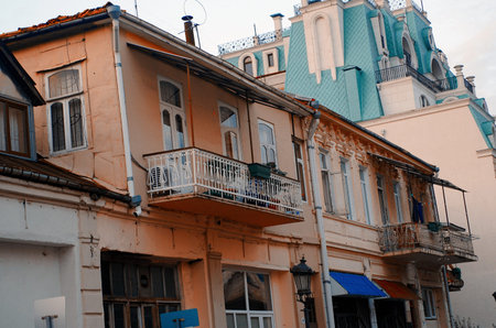 Georgia, Tbilisi - October 23, 2020: Houses with balconies in the historic district of Tbilisi. Georgia. Evening View. Beautiful Old town at sunset.