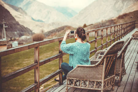 Girl making pictures on terrace with beautiful mountain view. Toned image
