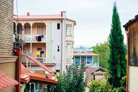 Georgia, Tbilisi - April 15, 2021: Houses with balconies in the historic district of Tbilisi. Georgia. Evening View. Beautiful Old town at sunset.