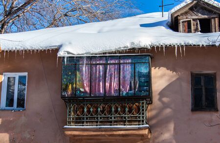 The old shabby facade of the building against the gray sky. Urban landscape. Emergency building.