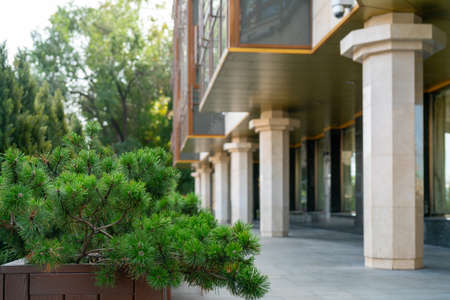 Decorative spruce in the urban space. Green branches of spruce on a city street.