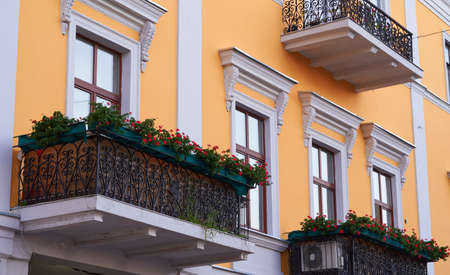 yellow wall and balcony decorated with flowers in the city