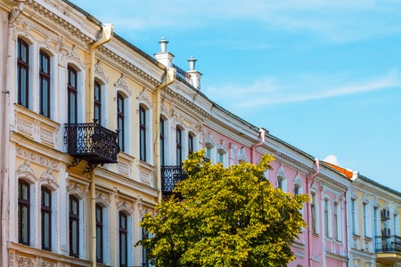 A low angle shot of colorful tenament houses facades in old town of Przemysl, Poland. Colorful old buildings in city center, houses with ornate yellow, blue and beige walls.