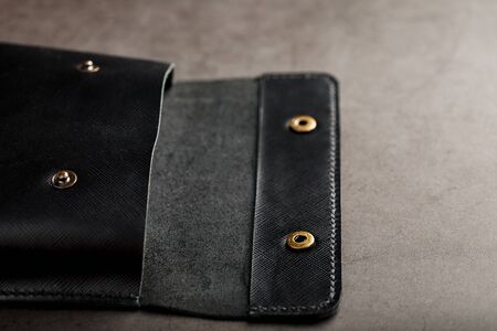 Black wallet made of genuine leather on a dark background. Handmade leather items. Rivets and seam close up