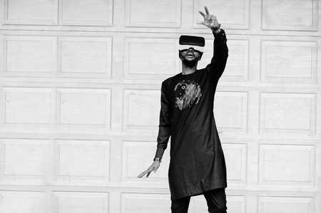 Rich african man in stylish traditional clothes in vr glasses. Future of Africa concept.