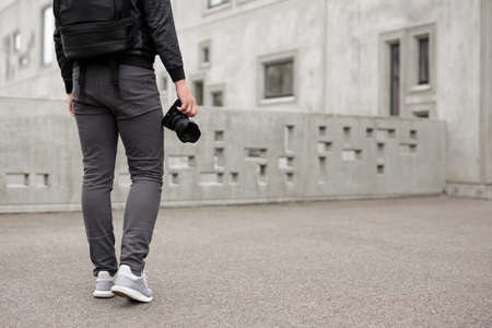 back view of male photographer walking with modern dslr camera, copy space over concrete building background