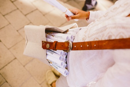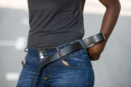 close-up size of woman in jeans. Young girl tied well her belt outside.
