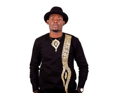 Portrait of a black young man wearing african traditional red colorful clothes.