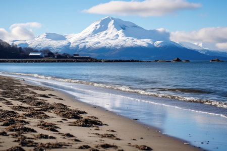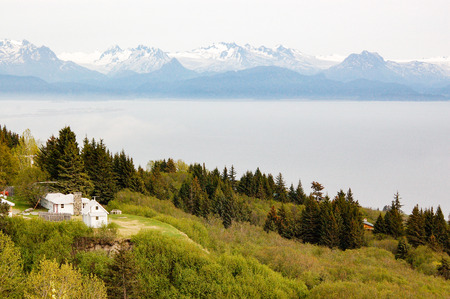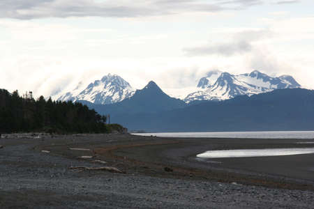 The scenery of Anchor Point with the faraway Katmai National Park and Preserve on the background along the Sterling highway to Homer in Alaska.