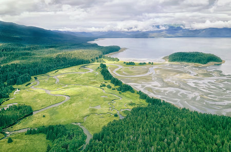Dense forest on the coast near Juneau. Panoramic top view. Landscape of southern Alaska, USA.