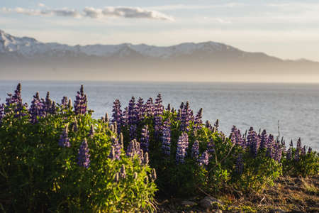 Blooming violet/purple Lupine flowers and snow covered mountains on background while sunset. Scenic panorama view of Icelandic landscape. HúsavÃk, North Iceland.