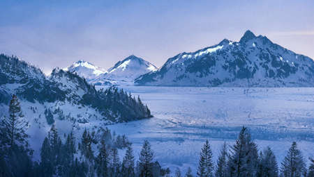 Snowy mountains of Alaska, landscape with forests, valleys, and rivers in daytime. Serene wilderness nature composition background wallpaper, travel destination, adventure outdoors