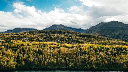 Aerial view of colorful fall trees and conifers at Denali national park in Alaska. High quality photo
