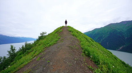A solitary figure stands at the end of a dirt trail on a lush green summit, enjoying the panoramic view of the water and mountains on a cloudy day.