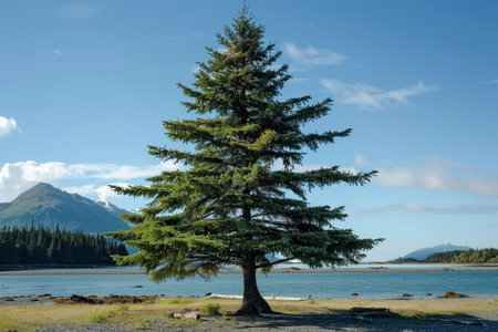 Lone pine tree is standing on the shore of a lake with mountains in the background on a sunny day