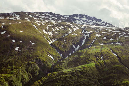 Juicy green slope of a mountain overgrown with dense vegetation with snow patches. Paterns and textures on high mount.