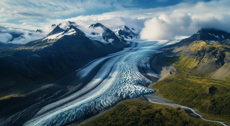 A vast glacier winds through steep mountain valleys, surrounded by greenery and clouds. Sunlight highlights the icy blue textures and rugged terrain, creating a stunning landscape.
