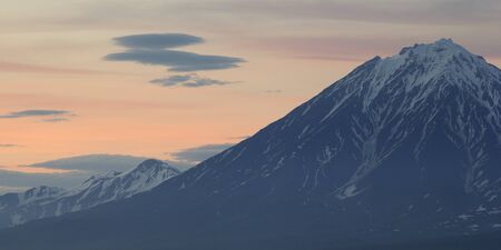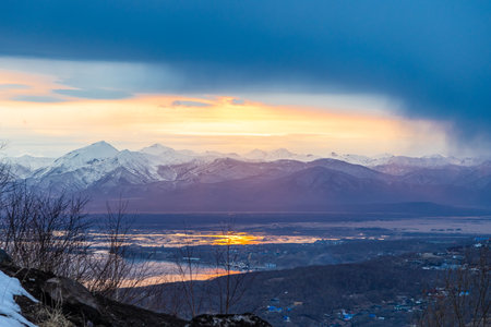 sunset over Avacha Bay and Petropavlovsk-Kamchatsky city from Mishennaya sopka in spring evening, Kamchatka Krai, Russia