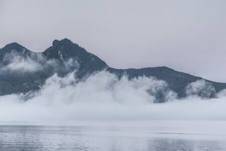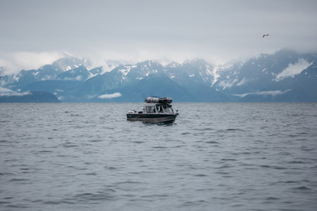 A fishing boat sailing in a lake surrounded by hills and mountains on a foggy morning in Alaska