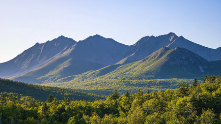 The panoramic view captures the Presidential Range bathed in soft morning light, revealing its towering peaks and vibrant greenery in the surrounding landscape.