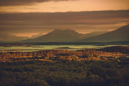 Scenic Midnight Sun Panoramic Wilderness Landscape Near the Hamsund Nordland, Norway.