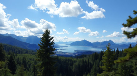 Explore a breathtaking view of a tranquil fjord surrounded by lush pine trees and majestic mountains, capturing the serene beauty of nature in overcast weather.