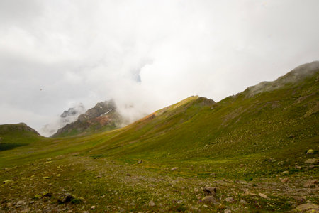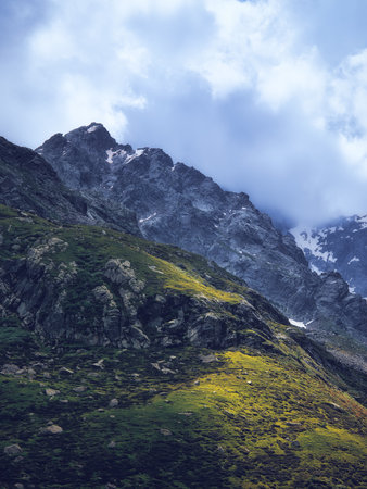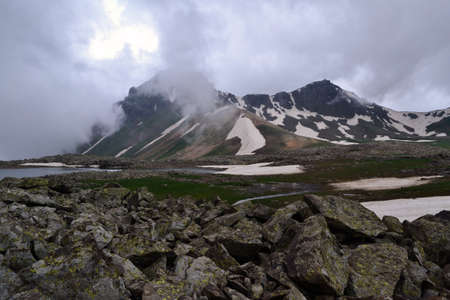 Summer mountains green grass snow and stormy sky landscape