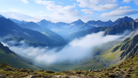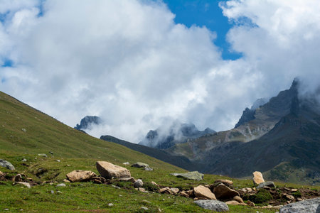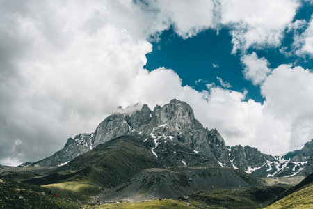 Beautiful mountain landscape at Caucasus mountains with clouds and blue sky
