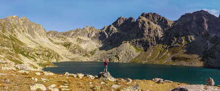 Mountain lake in the Tatras. A woman standing by the lake. Mountain tourism.