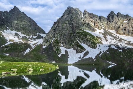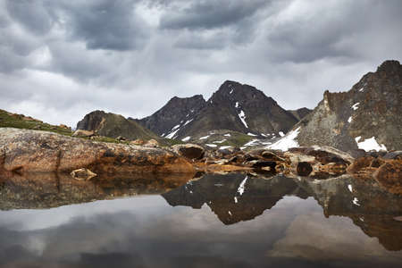 Beautiful scenery of the mountain lake and reflection of white snow mountain and dark rock in Kazakhstan, Central Asia