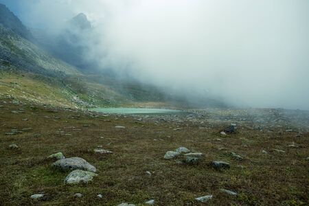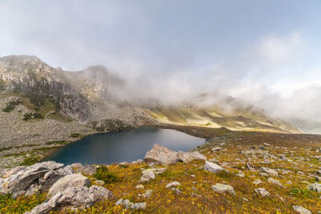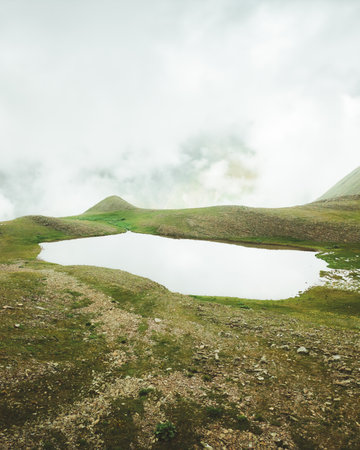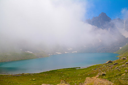 Mountain lake in the clouds. Summer landscape in the mountains.