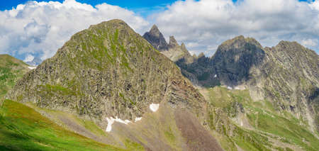 Panoramic mountain view. Beautiful panorama of the Caucasus Mountains with rocky ledges, snowy peaks, yellow meadows, dramatic cloudy sky
