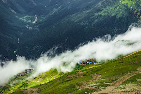 Mountain houses with clouds in Ayder Plateau, Rize, Turkey.
