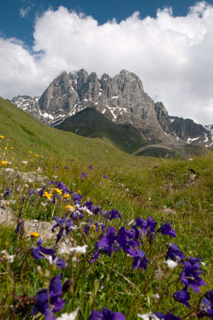 This is a summer in the high mountains. Chaukhi mountain group - Caucasus Mountains, Georgia is in the background, bright violet flowers are in the foreground.
