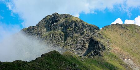 high mountain peaks among the clouds. wonderful summer landscape of fagaras ridge with some snow on hills. cloudy weather with blue sky