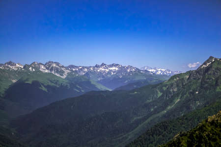 mountain landscape, view of the Caucasus Mountains with snow-capped peaks.