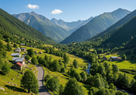 Beautiful mountain landscape with a small village in the middle of the valley