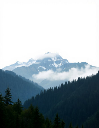 Mountain landscape with snow covered peaks and coniferous forest.