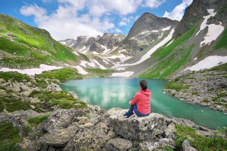 Landscape of Caucasus Dukka lake in mountain. Person and nature. Travel and relax scene.