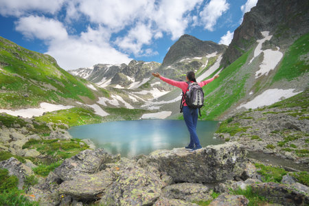 A journey man standing on a rock and look at mountains and lake. Freedom and Adventure concept