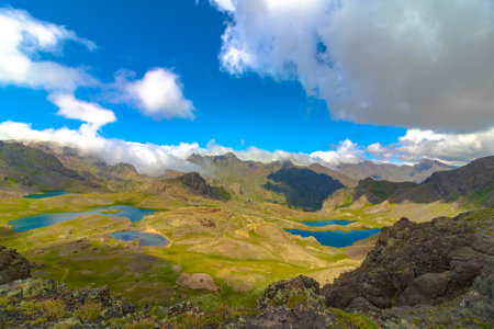Lakes on mountain tops and partly cloudy sky. Nature or landscape photo. Yedigoller in Ispir district of Erzurum province of Turkey.